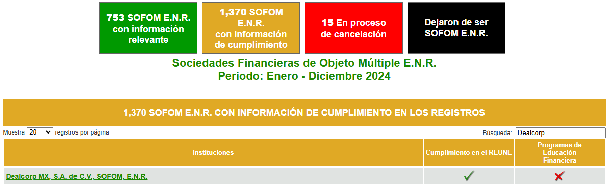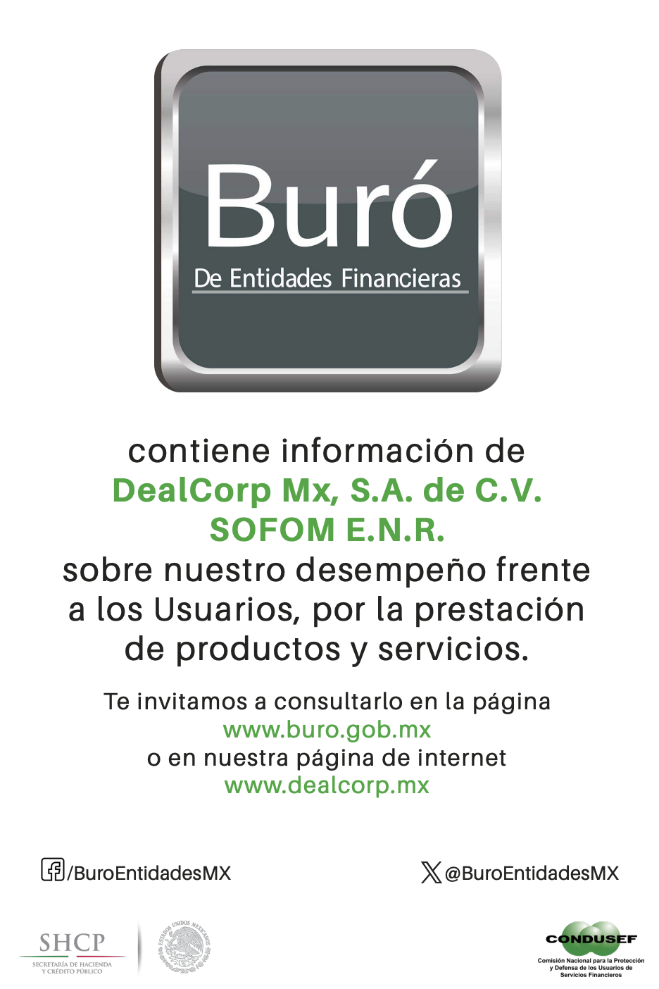 Esta información corresponde únicamente a DealCorp Mx, S.A. de C.V., SOFOM E.N.R. Para conocer la información de todo el sector de Sociedades Financieras Populares y demás instituciones de crédito, puede acceder al sitio http://www.buro.gob.mx.